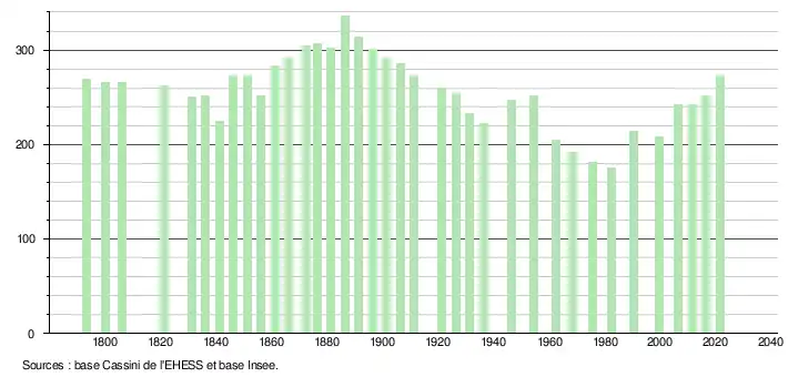 L'évolution du nombre d'habitants est connue à travers les recensements de la population effectués dans la commune depuis 1793. Pour les communes de moins de 10 000 habitants, une enquête de recensement portant sur toute la population est réalisée tous les cinq ans, les populations légales des années intermédiaires étant quant à elles estimées par interpolation ou extrapolation[25]. Pour la commune, le premier recensement exhaustif entrant dans le cadre du nouveau dispositif a été réalisé en 2006[26].