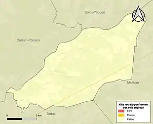 Le retrait-gonflement des sols argileux est susceptible d'engendrer des dommages importants aux bâtiments en cas d’alternance de périodes de sécheresse et de pluie. Aucune partie du territoire de la commune n'est en aléa moyen ou fort (19,2 % au niveau départemental et 48,5 % au niveau national). Sur les 236 bâtiments dénombrés sur la commune en 2019, aucun n'est en aléa moyen ou fort, à comparer aux 17 % au niveau départemental et 54 % au niveau national. Une cartographie de l'exposition du territoire national au retrait gonflement des sols argileux est disponible sur le site du BRGM[21],[Carte 2].