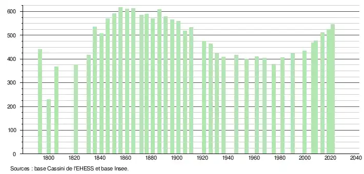 | L'évolution du nombre d'habitants est connue à travers les recensements de la population effectués dans la commune depuis 1793. Pour les communes de moins de 10 000 habitants, une enquête de recensement portant sur toute la population est réalisée tous les cinq ans, les populations légales des années intermédiaires étant quant à elles estimées par interpolation ou extrapolation[23]. Pour la commune, le premier recensement exhaustif entrant dans le cadre du nouveau dispositif a été réalisé en 2008[24]. En 2021, la commune comptait 547 habitants[Note 3], en augmentation de 8,1 % par rapport à 2015 (Landes : +4,9 %, France hors Mayotte : +1,84 %). |