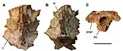 - En 2015, un grand arc neural d'une vertèbre dorsale des lits de Kem Kem est décrit de manière informelle comme appartenant à un nouveau genre et une nouvelle espèce de mégaraptorien nommé Osteoporosia gigantea. Ce spécimen appartient au chef d'une chaîne de parcs à thème polonais qui le décrit comme appartenant à un carnosaure de 15 m de long semblable à Mapusaurus et à Carcharodontosaurus[37]. Cependant, il est de taille beaucoup plus petit que proposé et pourrait appartenir à C. saharicus ou à Sauroniops en fonction de ses caractéristiques et de son origine de carcharodontosauridé[38].