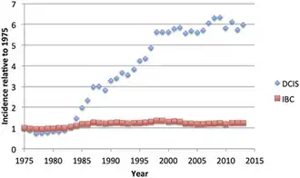 Environ 20 % des CCIS ayant donné lieu à une intervention chirurgicale révèlent, après analyse histologique, la présence d'une forme envahissante (cancer du sein)[38],[46].
