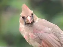 Le Cardinal rouge femelle peut être confondue avec la femelle du Cardinal pyrrhuloxia, mais cette dernière a un bec jaune, dont la forme n'est pas conique mais rappelle plutôt celle du bec de perroquet, et ne possède pas de masque sombre.