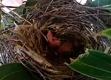 La femelle construit un nid en forme de coupe de 1 à 3 mètres du sol dans un lieu bien camouflé, comme un arbuste dense ou un arbre. Le nid en forme de coupe est constitué de brindilles minces, de bandes d’écorce, d'aiguilles de conifère, de tiges flexibles et de petites racines, et l’intérieur est recouvert de feuilles mortes, d’herbes ou d’autres fibres végétales[9],[16]. Les œufs sont pondus 1-6 jours après la construction du nid. La femelle pond 3-4 œufs et la ponte a lieu deux à quatre fois par année[16]. Les œufs sont blancs avec des teintes verte, bleue ou brune et sont marqués de taches lavande, grise ou brune. Ces taches sont plus importantes près de l’extrémité la plus large de l’œuf[17]. Les dimensions de ces œufs sont de 22,4 à 27,9 mm x 16,9 à 19,6 mm[5]. La coquille est lisse et légèrement lustrée[16]. En général, c'est la femelle qui couve les œufs, bien qu'à de rares occasions, le mâle puisse couver pendant de courtes périodes. L’incubation dure 12-13 jours[16]. À la naissance, les oisillons sont nidicoles, possèdent un rare duvet gris, et pèsent 3,5 g en moyenne[18] ; ils quittent le nid 10 ou 11 jours après l’éclosion. Le mâle s’occupe de nourrir les oisillons d’une couvée pendant que la femelle s'occupe de l'incubation de la couvée suivante[11].