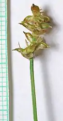 L'épillet est solitaire, terminal, multiflore, dioïque ; le mâle est linéaire-cylindracé, à écailles lancéolées, tandis que l'épillet femelle est ovoïde ou oblong, à écailles rousses, ovales-subobtuses et persistantes. La bractée est triangulaire aristée ; il y a 2 stigmates. Les utricules sont à la fin étalés, bruns, longs de 3 à 4 mm, plans convexes, nervés, atténués en bec assez court dépassant l'écaille ; l'akène est ovale et biconvexe[2].