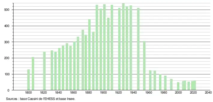 L'évolution du nombre d'habitants est connue à travers les recensements de la population effectués dans la commune depuis 1800. Pour les communes de moins de 10 000 habitants, une enquête de recensement portant sur toute la population est réalisée tous les cinq ans, les populations légales des années intermédiaires étant quant à elles estimées par interpolation ou extrapolation[11]. Pour la commune, le premier recensement exhaustif entrant dans le cadre du nouveau dispositif a été réalisé en 2008[12].