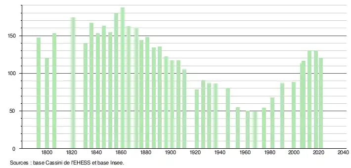L'évolution du nombre d'habitants est connue à travers les recensements de la population effectués dans la commune depuis 1793. Pour les communes de moins de 10 000 habitants, une enquête de recensement portant sur toute la population est réalisée tous les cinq ans, les populations légales des années intermédiaires étant quant à elles estimées par interpolation ou extrapolation[26]. Pour la commune, le premier recensement exhaustif entrant dans le cadre du nouveau dispositif a été réalisé en 2007[27].