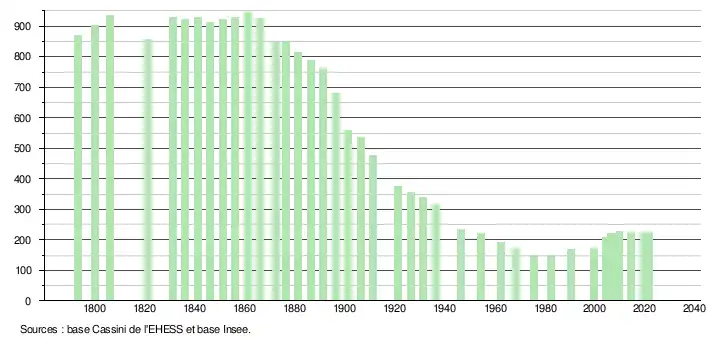 L'évolution du nombre d'habitants est connue à travers les recensements de la population effectués dans la commune depuis 1793. Pour les communes de moins de 10 000 habitants, une enquête de recensement portant sur toute la population est réalisée tous les cinq ans, les populations légales des années intermédiaires étant quant à elles estimées par interpolation ou extrapolation[40]. Pour la commune, le premier recensement exhaustif entrant dans le cadre du nouveau dispositif a été réalisé en 2004[41].