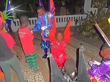 - Lanceurs de cordes : Des gens à demi-nus "avec leur peau luisante couverte d’un mélange de charbon écrasé et de sirop de canne, leurs têtes hérissées de cornes démoniaques, ces deux hommes nous toisent, implacables et altiers... Les cordes qu’ils tiennent entre les mains rappellent les entraves de leurs ancêtres esclaves"[12].