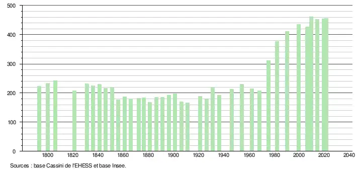 L'évolution du nombre d'habitants est connue à travers les recensements de la population effectués dans la commune depuis 1793. Pour les communes de moins de 10 000 habitants, une enquête de recensement portant sur toute la population est réalisée tous les cinq ans, les populations légales des années intermédiaires étant quant à elles estimées par interpolation ou extrapolation[47]. Pour la commune, le premier recensement exhaustif entrant dans le cadre du nouveau dispositif a été réalisé en 2004[48].