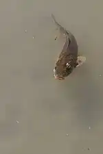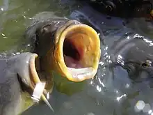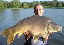 La carpe commune (Cyprinus carpio) est une espèce de poissons téléostéens de la famille des cyprinidés. Le nom de Carpe peut aussi désigner plusieurs formes mutantes, hybrides et d'élevage plus ou moins domestiquées, avec par exemple la carpe cuir, la carpe miroir ou Band-Carp, ou la carpe koï qui est l'une des sous-espèces de poissons les plus anciennement domestiquées[1]. Ces formes mutantes sont plus ovoïdes, au dos bossu et au ventre flasque, et caractérisées par des anomalies d'écaillures.