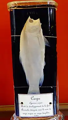 - Clonage : la gynogenèse est expérimentée au moins depuis les années 1980 sur cette espèce[34]. Des clones femelles homozygotes gynogénétiques de carpe commune ont par exemple pu être obtenus par manipulation d'œufs (fécondés, puis exposés à un choc thermique ; température de 40 °C durant 2 min, 28-30 min après la fécondation, puis « réactivés » par un sperme détruit par irradiation aux UV au cours de la première métaphase de la mitose, donnant 5 à 15 % d'alevins viables. Des hybrides F1 ont été produits par croisement de ces femelles avec des homozygotes mâles d'une fratrie gynogénétique. « La nature clonale de ces souches a été démontrée de manière non équivoque par l'acceptation d'allogreffes de peau échangés réciproquement », précisent (en 1991) les auteurs de ces expérimentations[35] ;