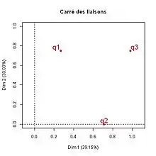 Le carré des liaisons est une représentation graphique utile dans l’analyse factorielle d’un tableau individus x variables. Cette représentation complète les représentations classiques de l’Analyse en composantes principales (ACP) et de l’Analyse des correspondances multiples (ACM), à savoir celles des individus, des variables quantitatives (par leur coefficient de corrélation avec les facteurs) et celle des modalités des variables qualitatives (au barycentre des individus qui les possèdent).