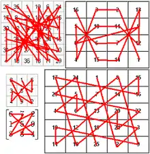 Si l'on relie les nombres de certains carrés magiques dans l'ordre croissant, on obtient une figure qui présente une symétrie centrale (voir image ci-contre). Cette propriété est fausse dans le cas général[note 2].