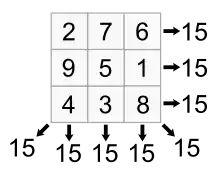 Les sommes des deux carrés magiques des mêmes ordres donnent également des carrés magiques[8], mais le résultat n'est pas normal, c'est-à-dire que les nombres ne forment pas la suite 1, 2, 3... Également, la différence de deux carrés magiques du même ordre donne également un carré magique, mais qui n'est pas normal.