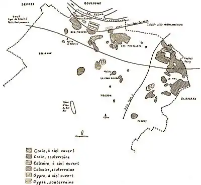 - de l'évolution de la région parisienne pendant une dizaine de millions d'années. La craie exploitée s'est formée vers la fin du Crétacé dans la mer de l'étage campanien, datant de 75 à 70 MA (millions d'années). Elle est recouverte par le calcaire de Meudon d'âge danien (65 MA) marquant la base des terrains tertiaires. Il manque le dernier étage du Crétacé qui a été érodé. Bel exemple de lacune. C'est ici le seul endroit d'Ile-de-France où un tel fait est visible.