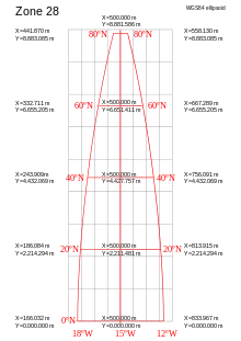- Un choix de données géodésiques qui comprend un choix d'ellipsoïde terrestre. Cela lie le système de coordonnées aux emplacements réels sur la Terre en contrôlant le cadre de mesure de la latitude et de la longitude (GCS pour « Geographic coordinate system »). Ainsi, il y aura une différence significative entre la coordonnée d'un emplacement dans « UTM NAD83 Zone 14N » et pour le même emplacement dans « UTM NAD27 Zone 14N », même si les formules UTM sont identiques, car les valeurs sous-jacentes de latitude et de longitude sont différentes. Dans certains logiciels SIG, cette partie de la définition recouvre le choix d'un système de coordonnées géographiques particulier.