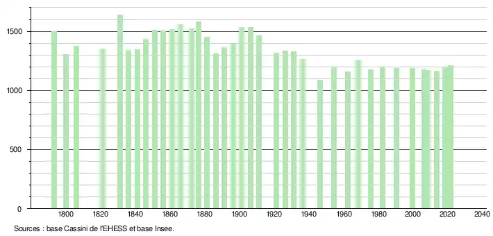 L'évolution du nombre d'habitants est connue à travers les recensements de la population effectués dans la commune depuis 1793. Pour les communes de moins de 10 000 habitants, une enquête de recensement portant sur toute la population est réalisée tous les cinq ans, les populations légales des années intermédiaires étant quant à elles estimées par interpolation ou extrapolation[23]. Pour la commune, le premier recensement exhaustif entrant dans le cadre du nouveau dispositif a été réalisé en 2008[24].