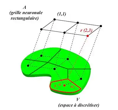 Soit A la grille neuronale rectangulaire d'une carte auto-organisatrice. Une carte de neurones affecte à chaque vecteur d'entrée un neurone désigné par son vecteur de position , tel que le vecteur référent soit le plus proche de v.
