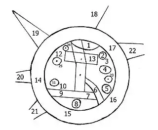 Sept triangles sur le cercle externe (périmètre de l'eau), sont nommés îles, mais la tablette d'argile endommagée a perdu les trois îles sur le bord inférieur de la tablette.