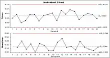 Les limites de contrôle s'obtiennent en calculant d'abord les valeurs absolues des différences entre deux données successives. Si le nombre de données est n, le nombre de résultats ainsi obtenus est donc n -1. Soit m la moyenne de ces résultats. La distance des limites de contrôle à la ligne moyenne du graphique est 2,66 x m.