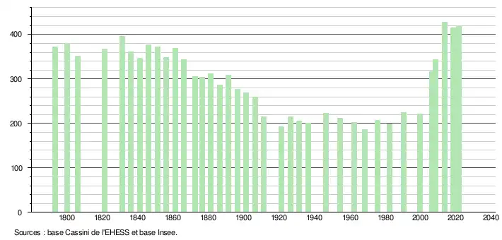 L'évolution du nombre d'habitants est connue à travers les recensements de la population effectués dans la commune depuis 1793. Pour les communes de moins de 10 000 habitants, une enquête de recensement portant sur toute la population est réalisée tous les cinq ans, les populations légales des années intermédiaires étant quant à elles estimées par interpolation ou extrapolation[17]. Pour la commune, le premier recensement exhaustif entrant dans le cadre du nouveau dispositif a été réalisé en 2008[18].