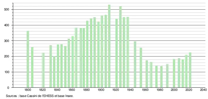 L'évolution du nombre d'habitants est connue à travers les recensements de la population effectués dans la commune depuis 1800. Pour les communes de moins de 10 000 habitants, une enquête de recensement portant sur toute la population est réalisée tous les cinq ans, les populations légales des années intermédiaires étant quant à elles estimées par interpolation ou extrapolation[9]. Pour la commune, le premier recensement exhaustif entrant dans le cadre du nouveau dispositif a été réalisé en 2006[10].