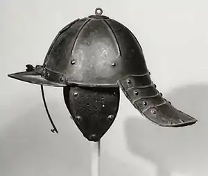 Cette forme de casque a été largement utilisée pendant la guerre de Trente Ans et la guerre civile anglaise ; il était communément appelé zischägge en Allemagne et «pot de cavalier» ou «pot à trois barreaux» en Grande-Bretagne; le terme «pot à queue de homard» est largement utilisé dans les études modernes. Le chevalier typique de l'époque, l'arquebusier, aurait porté le casque avec un manteau couleur chamois, une paire de gantelet, une cuirasse et une plaque arrière. Il était aussi parfois porté par un type de cavalerie plus fortement blindé, le cuirassier, associé à une armure de trois-quarts[9]. Il a été utilisé par la cavalerie des deux côtés de la guerre civile anglaise, y compris la Cavalerie Ironside d'Oliver Cromwell[2]. L'idée fausse commune selon laquelle les Cavaliers portaient des chapeaux à larges bords à plumes tandis que les Têtes-Rondes portaient des casques est éloquemment réfutée par un ordre survivant signé par Charles Ier lui-même pour 33 "potts", avec d'autres armures de cavalerie, pour l'usage de sa propre troupe de cheval en 1642. Un autre ordre, émanant cette fois des autorités parlementaires, datant de 1644 pour 300 "potts à trois barres anglaises" indique que chaque casque, sans doute de qualité fondamentale, coûte 7 shillings[10]. Des casques similaires ont été portés au XVIIe siècle par des hussards ailés polonais et ont été appelés szyszak en polonais, là encore un dérivé du nom turc d'origine[11]. Les cuirassiers autrichiens étaient équipés du casque à queue de homard jusque dans les années 1780, longtemps après que son utilisation ait pris fin ailleurs, comme lors d'une campagne contre les Turcs ottomans[12].