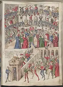 Le casque repose généralement sur le bouclier, car il est courant au Moyen Âge d'incliner le bouclier et de placer le casque sur le coin supérieur gauche du bouclier, ce qui est probablement aussi courant dans les tournois à des fins de présentation. Il est également courant de placer le casque à côté du bouclier.