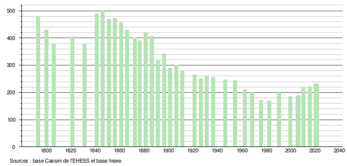 L'évolution du nombre d'habitants est connue à travers les recensements de la population effectués dans la commune depuis 1793. Pour les communes de moins de 10 000 habitants, une enquête de recensement portant sur toute la population est réalisée tous les cinq ans, les populations légales des années intermédiaires étant quant à elles estimées par interpolation ou extrapolation[32]. Pour la commune, le premier recensement exhaustif entrant dans le cadre du nouveau dispositif a été réalisé en 2005[33].