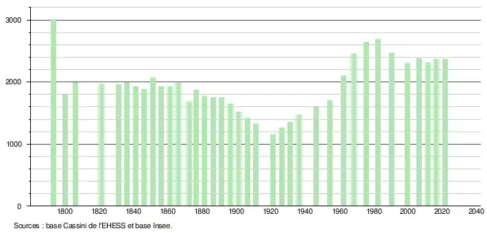 L'évolution du nombre d'habitants est connue à travers les recensements de la population effectués dans la commune depuis 1793. Pour les communes de moins de 10 000 habitants, une enquête de recensement portant sur toute la population est réalisée tous les cinq ans, les populations légales des années intermédiaires étant quant à elles estimées par interpolation ou extrapolation[31]. Pour la commune, le premier recensement exhaustif entrant dans le cadre du nouveau dispositif a été réalisé en 2006[32].
