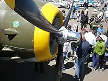 Sur un moteur de B-25J Mitchell, casserole d'hélice en métal.
