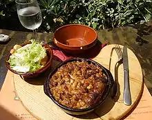 Le cassoulet est un plat traditionnel dont la base est un ragoût de haricots blancs, longuement mijoté pour être fondant en bouche — c'est là le secret de la réussite. Dans ce ragoût sont ajoutés, selon les versions, du confit d'oie ou de canard, du lard, de la couenne, du jarret de porc, de la saucisse, de l'agneau ou de la perdrix. On peut y trouver aussi de la tomate, du céleri ou de la carotte. Il peut être ou non recouvert de chapelure[8].