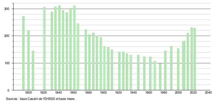 L'évolution du nombre d'habitants est connue à travers les recensements de la population effectués dans la commune depuis 1793. Pour les communes de moins de 10 000 habitants, une enquête de recensement portant sur toute la population est réalisée tous les cinq ans, les populations légales des années intermédiaires étant quant à elles estimées par interpolation ou extrapolation[26]. Pour la commune, le premier recensement exhaustif entrant dans le cadre du nouveau dispositif a été réalisé en 2007[27].