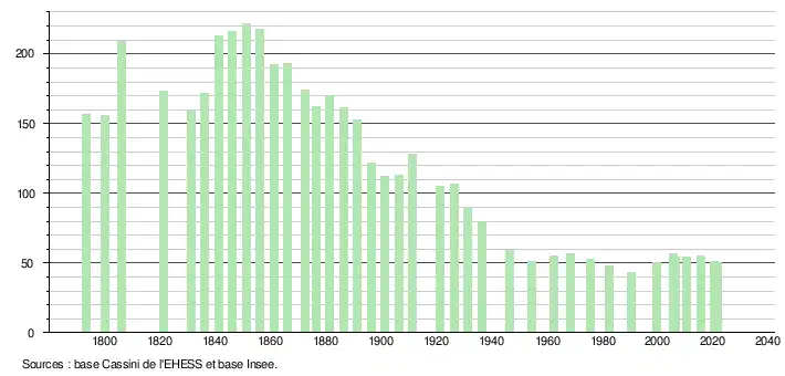 L'évolution du nombre d'habitants est connue à travers les recensements de la population effectués dans la commune depuis 1793. Pour les communes de moins de 10 000 habitants, une enquête de recensement portant sur toute la population est réalisée tous les cinq ans, les populations légales des années intermédiaires étant quant à elles estimées par interpolation ou extrapolation[43]. Pour la commune, le premier recensement exhaustif entrant dans le cadre du nouveau dispositif a été réalisé en 2005[44].