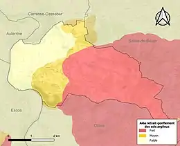 Le retrait-gonflement des sols argileux est susceptible d'engendrer des dommages importants aux bâtiments en cas d’alternance de périodes de sécheresse et de pluie[32]. 73,6 % de la superficie communale est en aléa moyen ou fort (59 % au niveau départemental et 48,5 % au niveau national)[Carte 6]. Depuis le , en application de la loi ELAN, différentes contraintes s'imposent aux vendeurs, maîtres d'ouvrages ou constructeurs de biens situés dans une zone classée en aléa moyen ou fort[Note 9],[33].