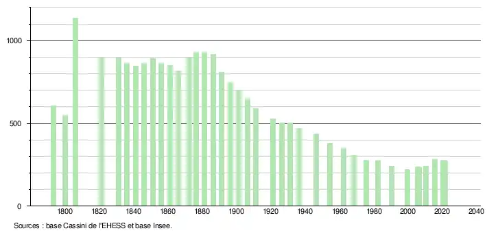 L'évolution du nombre d'habitants est connue à travers les recensements de la population effectués dans la commune depuis 1793. Pour les communes de moins de 10 000 habitants, une enquête de recensement portant sur toute la population est réalisée tous les cinq ans, les populations légales des années intermédiaires étant quant à elles estimées par interpolation ou extrapolation[27]. Pour la commune, le premier recensement exhaustif entrant dans le cadre du nouveau dispositif a été réalisé en 2005[28].