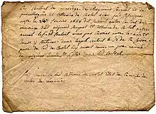 Dans les « Rôle de contributions XVIIIe siècle »[36], on trouve des documents du XIXe siècle : en 1816, le Castel Noël est affermé et son fermier se nomme Jean Ladout (il signe en bas de la page). À la suite d’un orage et d’une inondation survenus les 7 et 9 juillet 1816, Jean Ladout a perdu 4 champs de récoltes de blé noir et [froment ?] d’une contenance de 200 setérées, évalués à 1 000 francs, deux près d’une contenance de 140 setérées, d’une valeur de 800 francs, deux veaux d’une valeur de 200 francs, 3 jeunes cochons évalués à 48 francs, 5 moutons ou brebis d’une valeur de 80 francs. 528 francs de perte d’animaux et 2 328 francs (7 612 euros) de pertes totales (somme qui ne correspond pas à la somme des pertes effectives, évaluée à 2 098 francs (6 860 euros) dans l’encart de gauche).