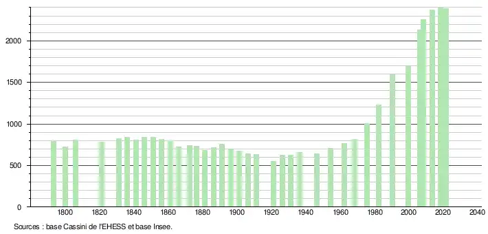 L'évolution du nombre d'habitants est connue à travers les recensements de la population effectués dans la commune depuis 1793. Pour les communes de moins de 10 000 habitants, une enquête de recensement portant sur toute la population est réalisée tous les cinq ans, les populations légales des années intermédiaires étant quant à elles estimées par interpolation ou extrapolation[34]. Pour la commune, le premier recensement exhaustif entrant dans le cadre du nouveau dispositif a été réalisé en 2008[35].