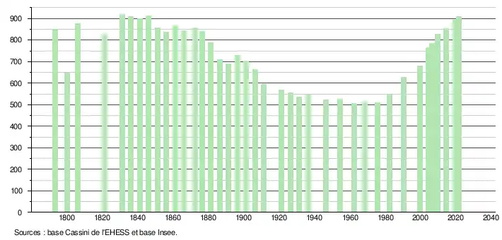 L'évolution du nombre d'habitants est connue à travers les recensements de la population effectués dans la commune depuis 1793. Pour les communes de moins de 10 000 habitants, une enquête de recensement portant sur toute la population est réalisée tous les cinq ans, les populations légales des années intermédiaires étant quant à elles estimées par interpolation ou extrapolation[28]. Pour la commune, le premier recensement exhaustif entrant dans le cadre du nouveau dispositif a été réalisé en 2004[29].