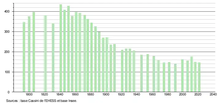L'évolution du nombre d'habitants est connue à travers les recensements de la population effectués dans la commune depuis 1793. Pour les communes de moins de 10 000 habitants, une enquête de recensement portant sur toute la population est réalisée tous les cinq ans, les populations légales des années intermédiaires étant quant à elles estimées par interpolation ou extrapolation[24]. Pour la commune, le premier recensement exhaustif entrant dans le cadre du nouveau dispositif a été réalisé en 2006[25].