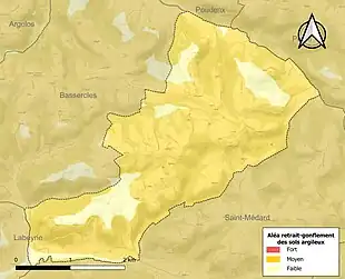 Le retrait-gonflement des sols argileux est susceptible d'engendrer des dommages importants aux bâtiments en cas d’alternance de périodes de sécheresse et de pluie. 86,4 % de la superficie communale est en aléa moyen ou fort (19,2 % au niveau départemental et 48,5 % au niveau national). Sur les 67 bâtiments dénombrés sur la commune en 2019, 51 sont en aléa moyen ou fort, soit 76 %, à comparer aux 17 % au niveau départemental et 54 % au niveau national. Une cartographie de l'exposition du territoire national au retrait gonflement des sols argileux est disponible sur le site du BRGM[19],[Carte 2].