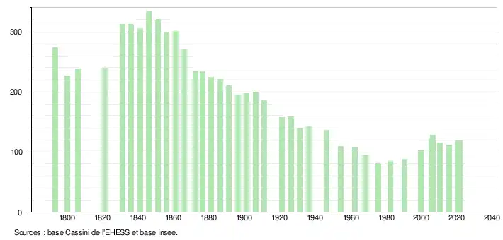 L'évolution du nombre d'habitants est connue à travers les recensements de la population effectués dans la commune depuis 1793. Pour les communes de moins de 10 000 habitants, une enquête de recensement portant sur toute la population est réalisée tous les cinq ans, les populations légales des années intermédiaires étant quant à elles estimées par interpolation ou extrapolation[22]. Pour la commune, le premier recensement exhaustif entrant dans le cadre du nouveau dispositif a été réalisé en 2005[23].