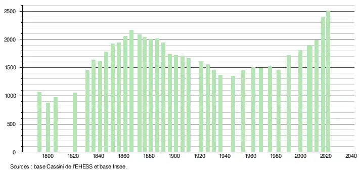 | L'évolution du nombre d'habitants est connue à travers les recensements de la population effectués dans la commune depuis 1793. Pour les communes de moins de 10 000 habitants, une enquête de recensement portant sur toute la population est réalisée tous les cinq ans, les populations légales des années intermédiaires étant quant à elles estimées par interpolation ou extrapolation[45]. Pour la commune, le premier recensement exhaustif entrant dans le cadre du nouveau dispositif a été réalisé en 2007[46]. En 2021, la commune comptait 2 505 habitants[Note 3], en augmentation de 18,16 % par rapport à 2015 (Landes : +4,9 %, France hors Mayotte : +1,84 %). |