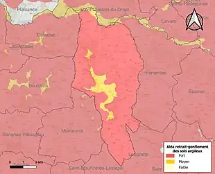 Le retrait-gonflement des sols argileux est susceptible d'engendrer des dommages importants aux bâtiments en cas d’alternance de périodes de sécheresse et de pluie[20]. La totalité de la commune est en aléa moyen ou fort (91,8 % au niveau départemental et 48,5 % au niveau national)[Carte 2]. Depuis le , en application de la loi ELAN, différentes contraintes s'imposent aux vendeurs, maîtres d'ouvrages ou constructeurs de biens situés dans une zone classée en aléa moyen ou fort[Note 2],[21].