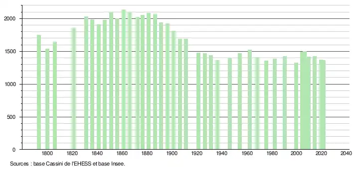 L'évolution du nombre d'habitants est connue à travers les recensements de la population effectués dans la commune depuis 1793. Pour les communes de moins de 10 000 habitants, une enquête de recensement portant sur toute la population est réalisée tous les cinq ans, les populations légales des années intermédiaires étant quant à elles estimées par interpolation ou extrapolation[27]. Pour la commune, le premier recensement exhaustif entrant dans le cadre du nouveau dispositif a été réalisé en 2004[28].