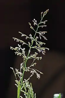 L'inflorescence est une panicule oblongue, atteignant 30 cm de longueur, généralement panachée de violet, à rameaux verticillés et scabres, longtemps incluse dans la gaine de la feuille terminale. Les épillets ont deux (rarement une ou trois) fleurs de petite taille (environ 4 mm), l'inférieure sessile et l'autre pédicellée ; les glumes sont inégales, la supérieure étant plus grande, arrondies, irrégulièrement dentées-crénelées au sommet ; les glumelles subégales, très semblables, sont tronquées au sommet, un peu cilié sur les trois nervures saillantes. La floraison a lieu en mai et juin[1].