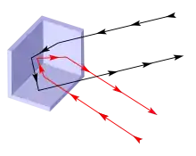 On considère un système composé de trois miroirs placés à angles droits dans les trois plans de l'espace (formant un trièdre, aussi appelé « coin de cube »). Lorsque la lumière atteint l'un des miroirs, elle est renvoyée vers le deuxième, puis vers le troisième, puis vers l'émetteur. Grâce à la perpendicularité des miroirs, les angles des réflexions successives se compensent, de manière à envoyer, à la fin, le rayon parallèlement au rayon incident, avec un léger décalage, lié à la distance entre le point d'entrée du rayon sur le premier miroir et le point de convergence des miroirs (décalage le plus souvent négligeable).