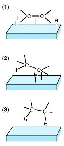 Étapes de l'hydrogénation d'une double liaison C=C à la surface d'un catalyseur, par exemple Ni ou Pt :