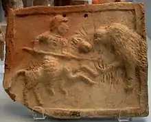 Cela était difficile car les étriers n'existaient pas encore même si la selle traditionnelle romaine possédait quatre cornes pour assurer la stabilité du cavalier[25] ; néanmoins, il était très difficile pour le cavalier de rester sur sa monture au moment de l'impact. Durant la période sassanide, les militaires perses développèrent une solution innovante pour surmonter le manque d'étrier et réellement « attacher » le cavalier à sa monture. Les cavaliers perses avaient un troussequin à l'arrière de la selle et deux lanières qui passaient au-dessus des cuisses et étaient solidement fixées à la selle ce qui permettait au cavalier de rester en place même en cas de choc violent[26]. Certaines représentations montrent les rois perses au combat dans des armures qui ne dépareilleraient pas dans une joute équestre au Moyen Âge[27]. Les cataphractaires emportaient souvent une deuxième arme comme une épée ou une masse d'arme pour l'utiliser lors des mêlées qui suivaient une charge.