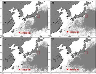 Simulation informatique de la circulation de particules radioactives rejetées en mer et emportées vers Taiwan, ici pour l'année 2021, avec le nombre de mois nécessaire, selon la saison, pour que les particules atteignent un point situé au large de Taiwan. Une autre partie du flux (non présentée ici) est emporté par un autre courant vers l'est (voir ci-dessous)